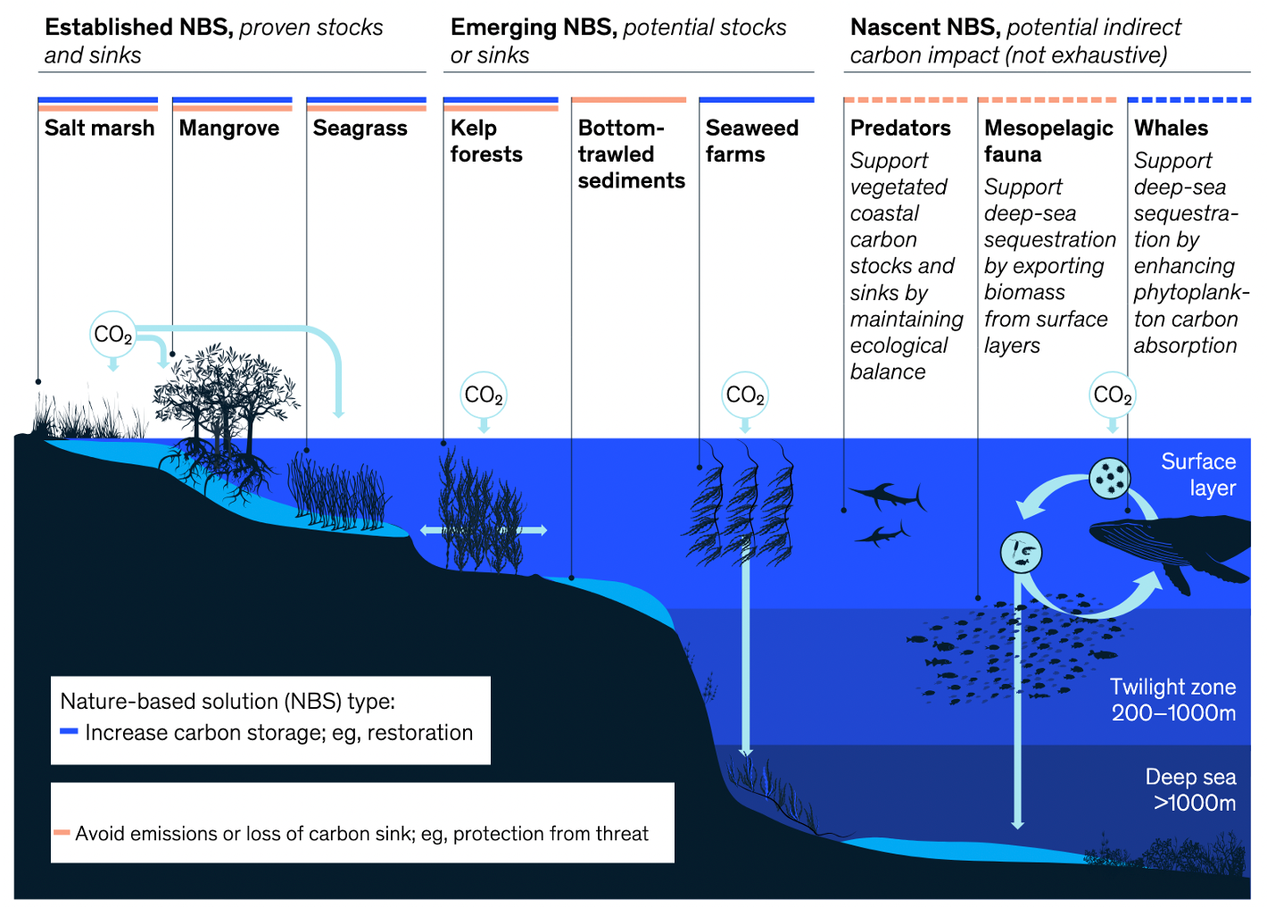Deep-sea sequestration of mesopelagic fauna presents an emerging NbS for marine ecosystems, by leveraging natural processes to enhance carbon capture and ecosystem resilience. It involves six key actions: