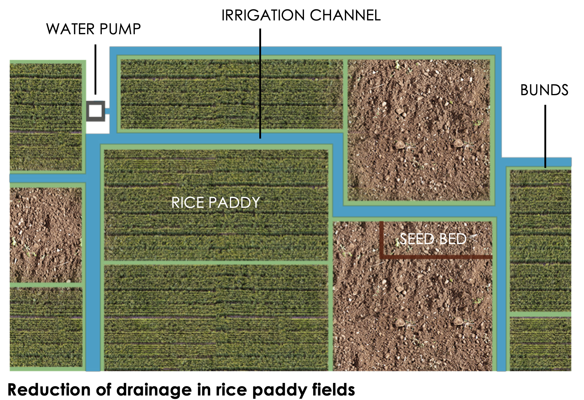 Drainage reduction in rice paddy fields addresses climate resilience and food security by optimizing water management through controlled irrigation and reduced water drainage.
