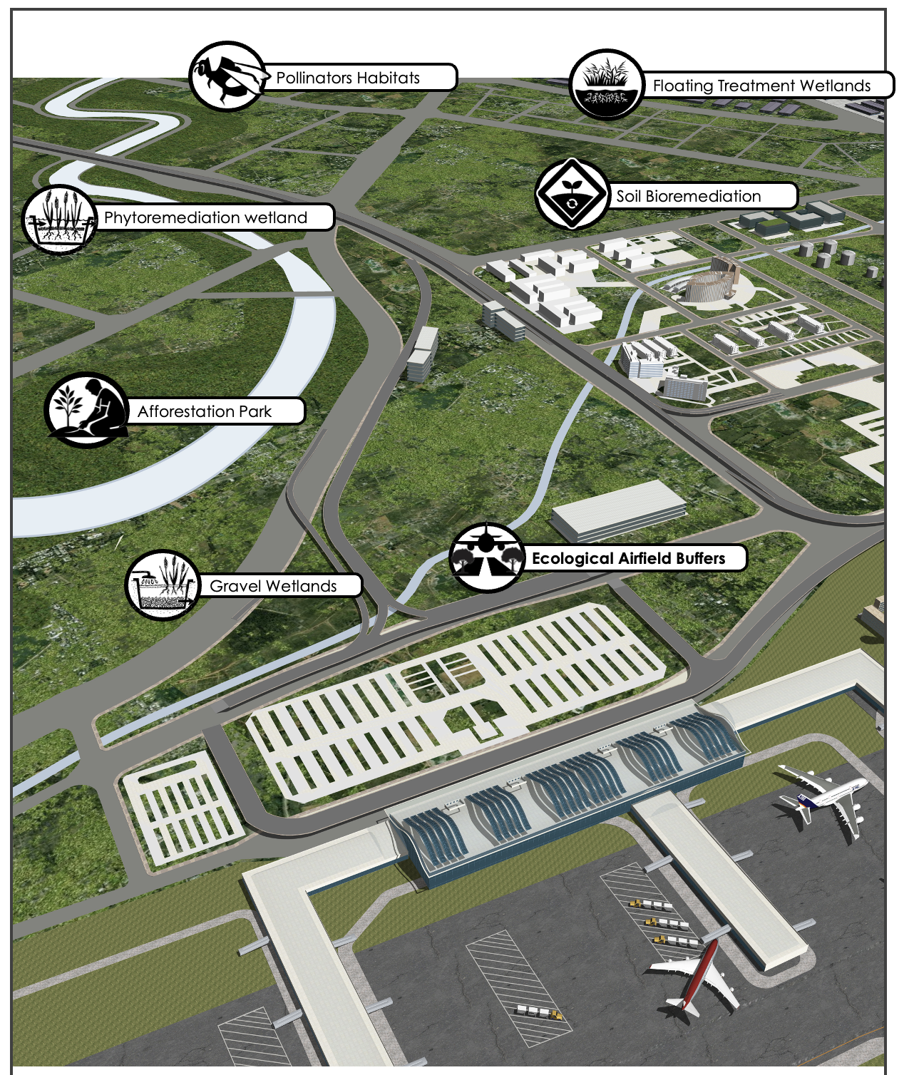 This approach integrates phytoremediation zones to restore and depollute airport grounds, biofiltration wetlands for stormwater management and pollutant filtration, and vegetated buffers to provide habitat connectivity while minimizing bird strikes near runways. The creation of ecological habitat islands and reforestation zones nearby compensates for habitat loss and sequesters carbon, aligning with regional climate goals.
