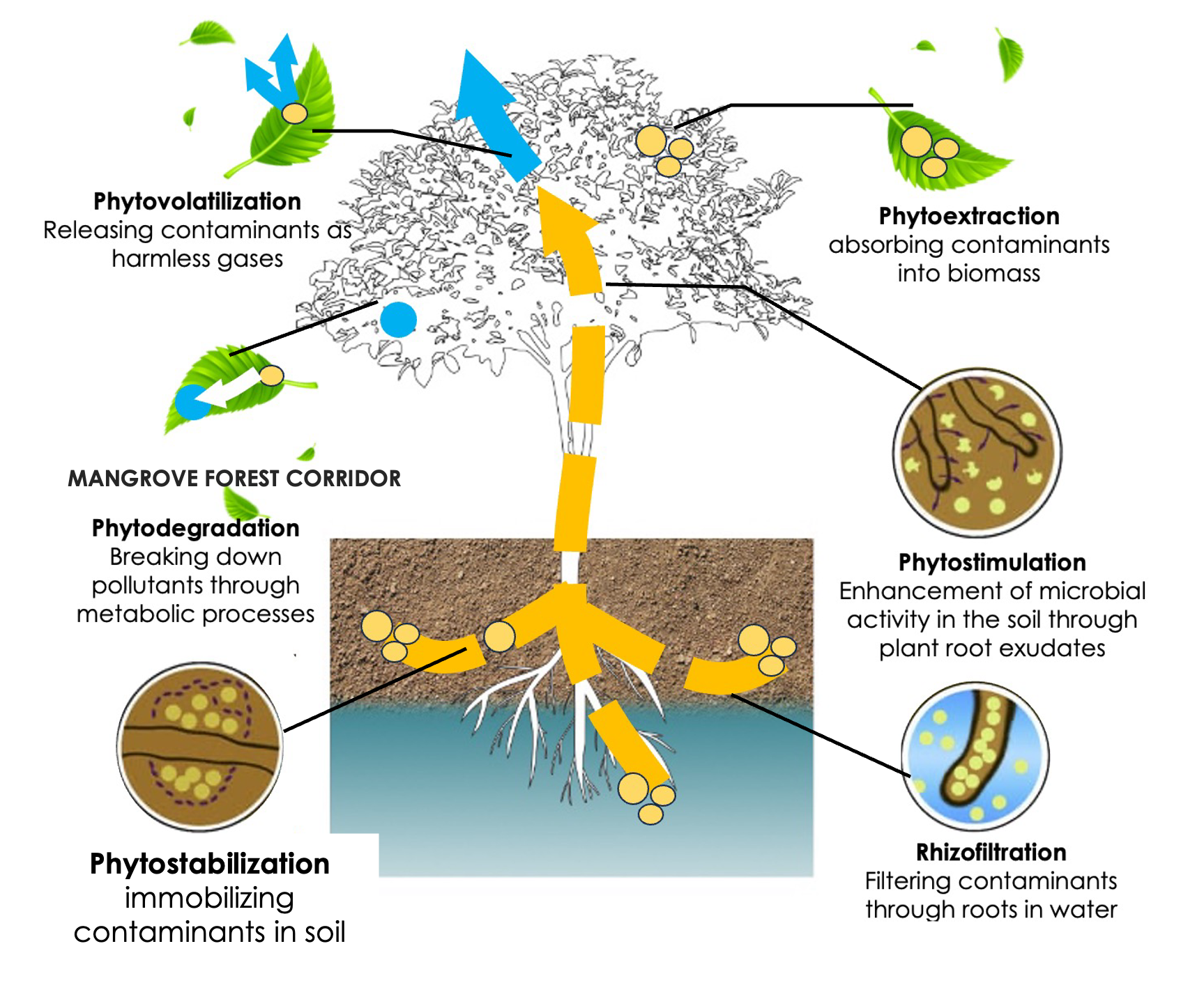 Phytoremediation forest corridors use plants and trees to remove, stabilize, or degrade contaminants in soil, water, and air, aiding in ecosystem restoration. Hyperaccumulator plants play a key role through processes like phytoextraction (absorbing contaminants), phytostabilization (immobilizing pollutants), phytodegradation (breaking down toxins), and rhizofiltration (filtering water contaminants).
