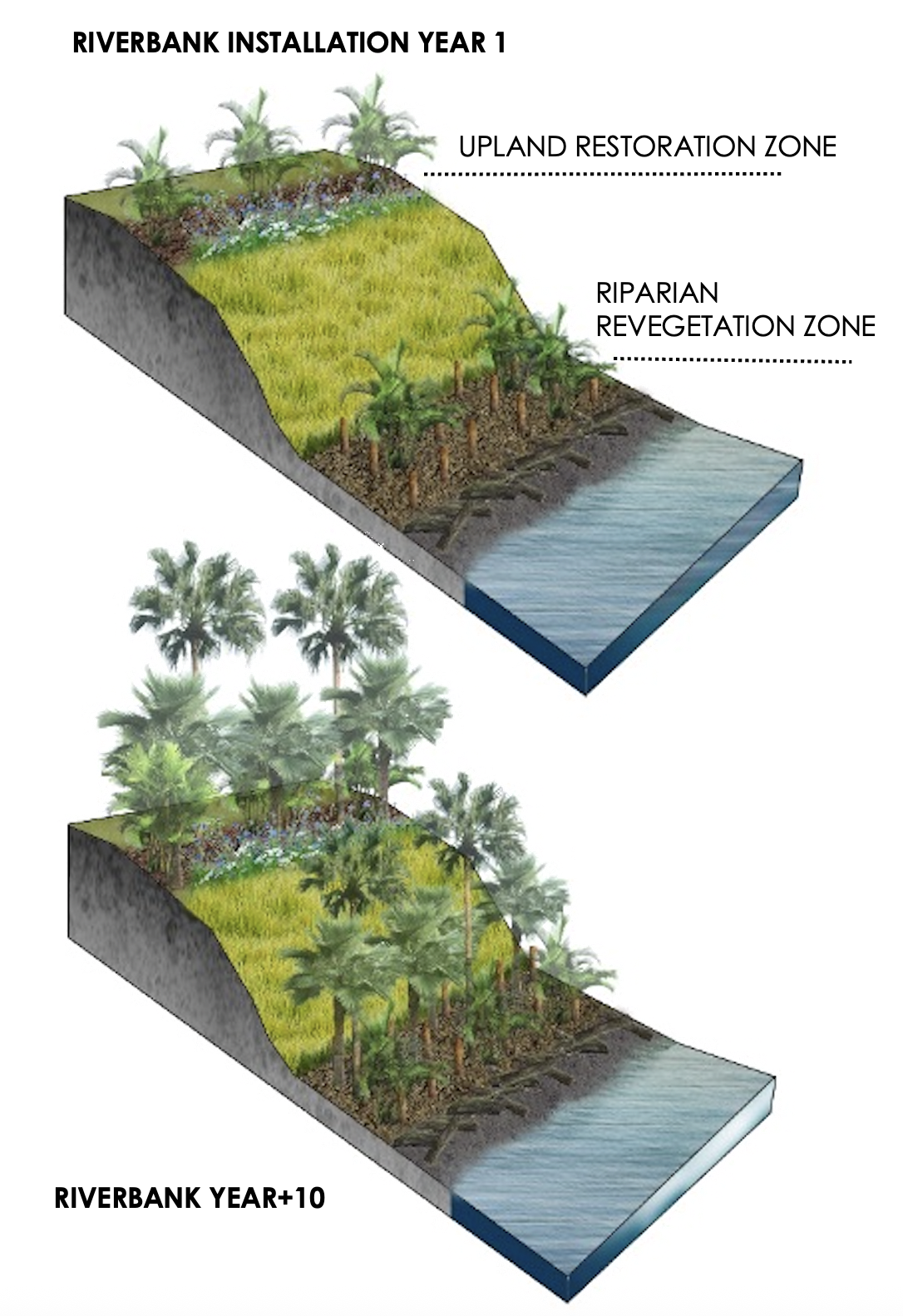 Native, flood-tolerant plants such as grasses, shrubs, and trees are planted to anchor the soil with their root systems, reducing the impact of water flow and promoting soil cohesion. These plants also help filter excess nutrients, improve water quality, and provide habitat for various species.