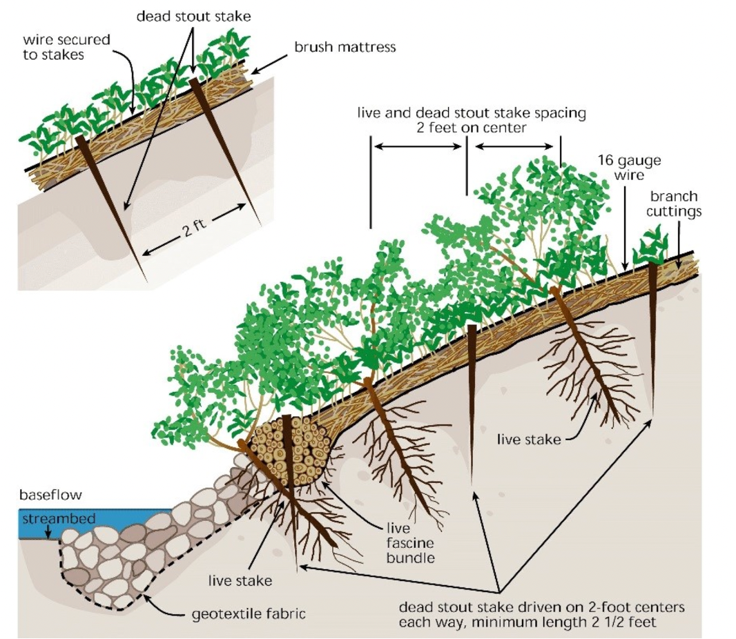 Stabilization techniques are employed to reinforce and protect riverbanks from the erosive forces of flowing water, especially during high-water events.
