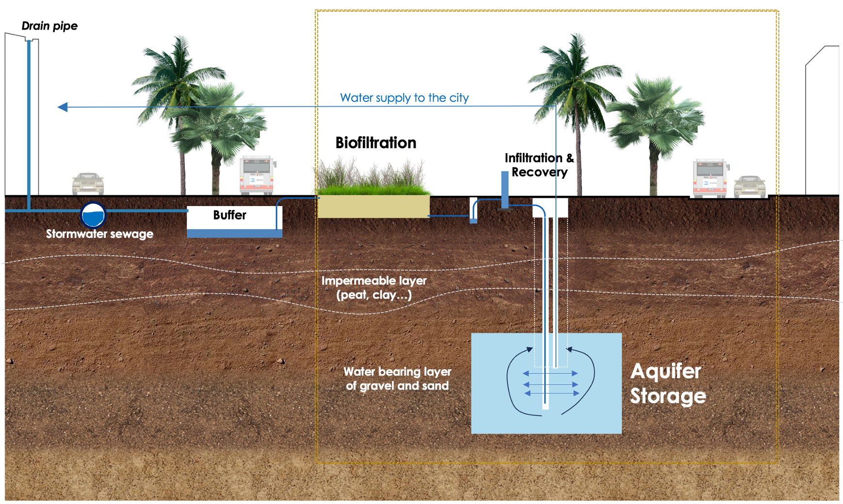 The urban water buffers is a NbS designed to enhance resilience to floods, aquifer depletion, land subsidence, and other climate-related risks. These systems collect, store, and infiltrate excess stormwater into aquifers during heavy rainfall, mitigating urban flooding, replenishing groundwater supplies, and preventing land subsidence caused by excessive groundwater extraction.
