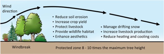 Agroforestry-integrated windbreaks provide additional income source (timber, fruits, fuelwood).